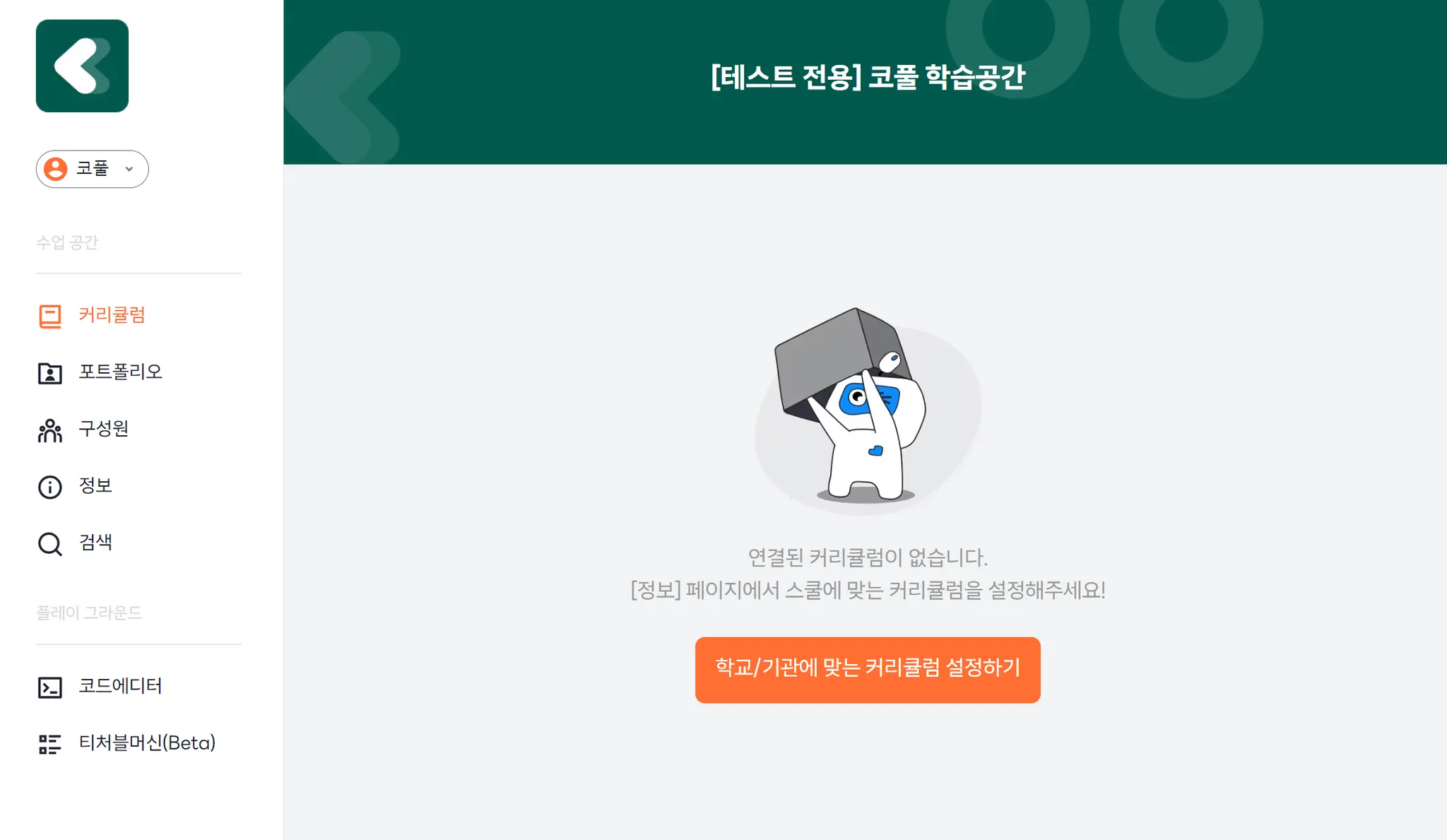 ② 커리큘럼 선택이 처음인 경우, 학교/기관에 맞는 커리큘럼 설정하기 버튼으로 커리큘럼을 빠르게 추가할 수 있습니다.