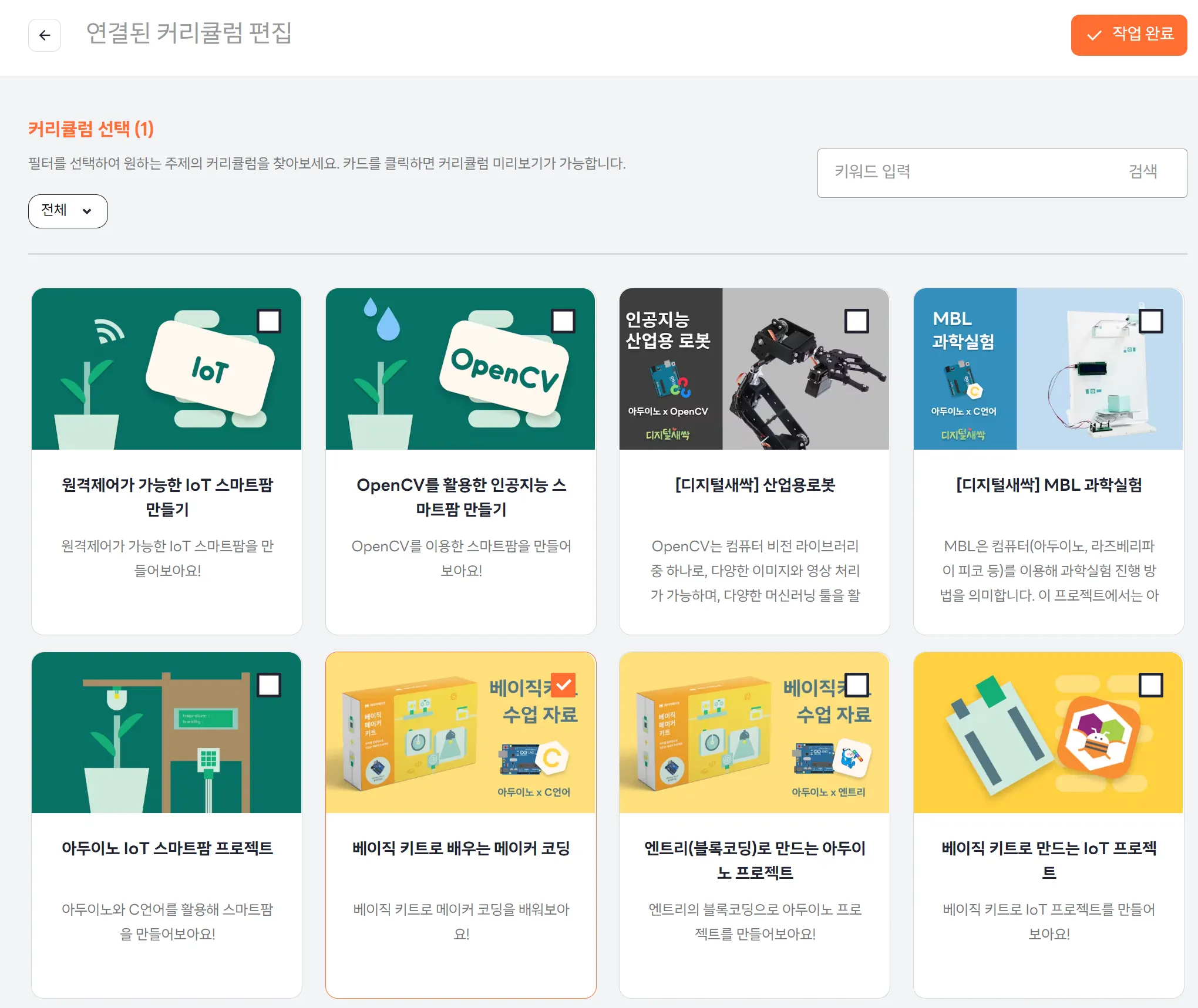 원하는 커리큘럼을 선택하고 작업완료 버튼을 눌러주세요.